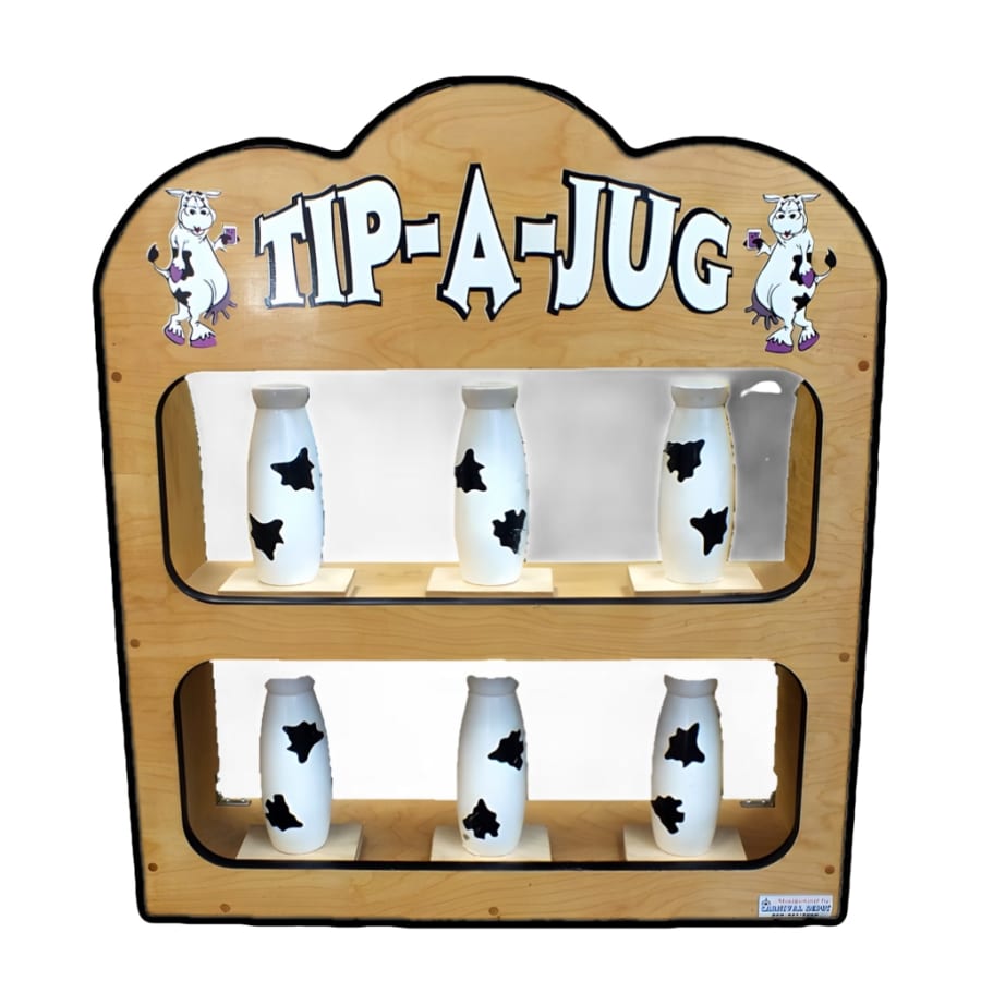 The objective of Tip A Jug is simple: players must try to knock down the old-fashioned milk jugs to win. Each player gets three tries to knock them down using a ball or bean bag. It's a game of skill, precision, and a little bit of luck. Gather your friends and see who can knock down the most jugs!