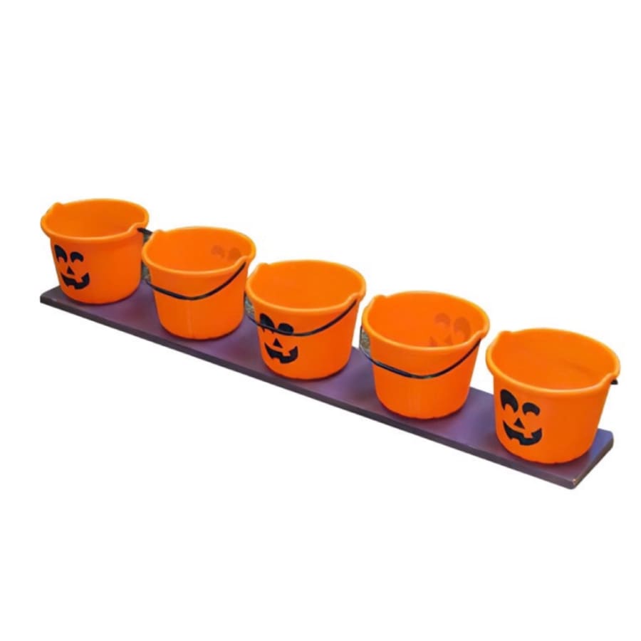 The objective of Pumpkin Buckets is simple: try to land a ping-pong ball in each of the buckets. Set up the buckets in a row, each one at a different distance from the throwing line. Take turns tossing the ping-pong ball, aiming to land it in the buckets. The player who successfully lands the ball in all the buckets wins!