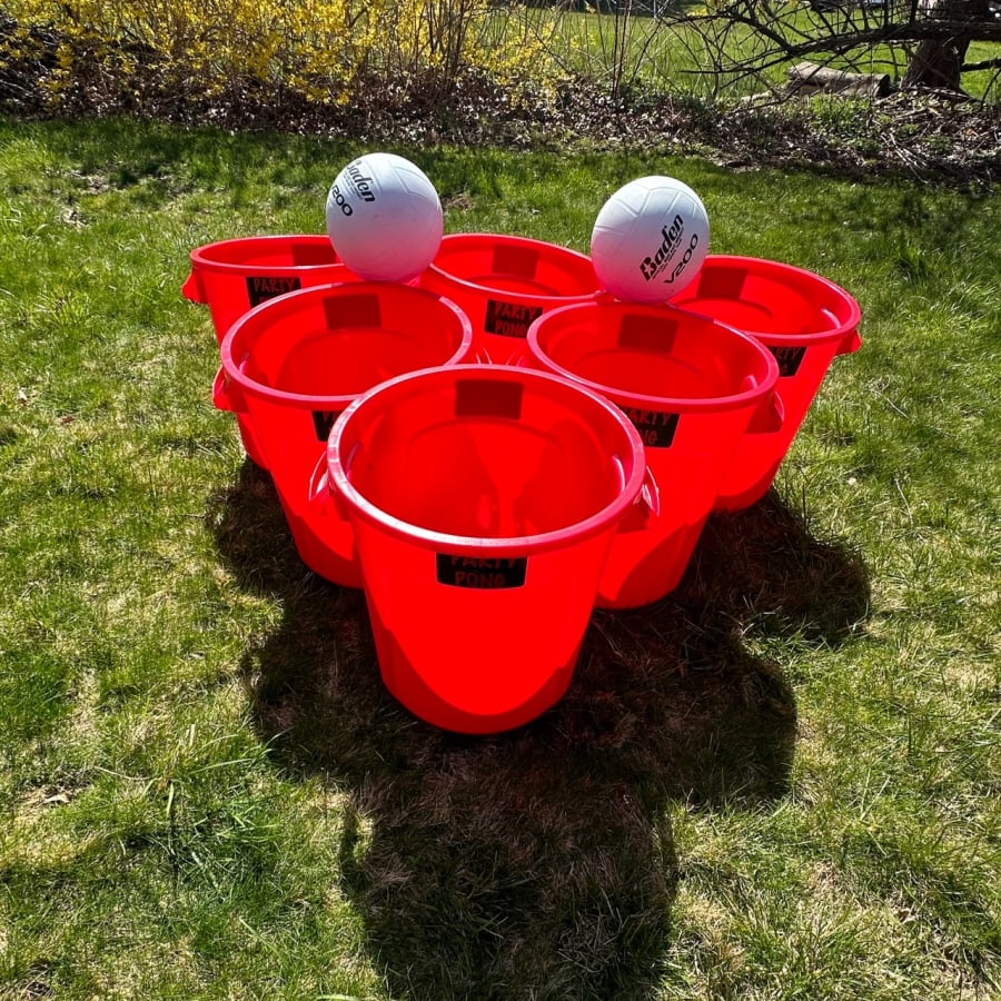 Giant Party Pong is a larger-than-life version of the classic game, featuring (12) 10 gallon giant buckets and 2 heavy-duty volley balls. Say goodbye to flimsy cups that blow away in the wind! Our buckets are designed to withstand any weather conditions, ensuring hours of fun and excitement.